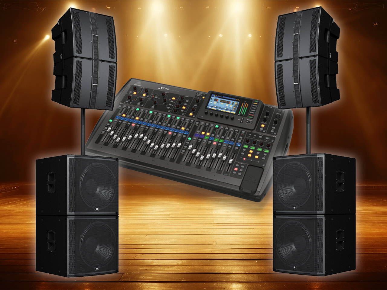 Paket čine: četiri aktivne gornje zvučne kutije 4 x 1000W, četiri aktivne SUB kutije 4 x 1kW, digitalna mikseta 32 kanala, komplet ožičenje, stalci.